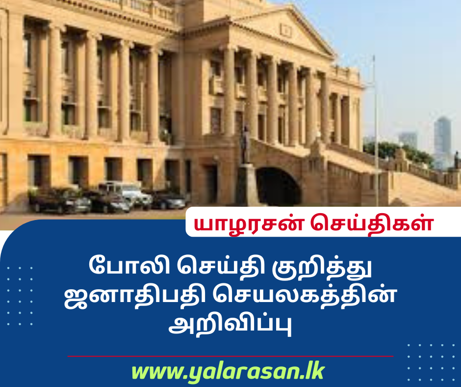 சமூக ஊடகங்களில் பரப்பப்படும் போலியான செய்தி குறித்து ஜனாதிபதி செயலகம் அறிவிப்பு ஒன்றை வௌியிட்டுள்ளது. ‘கிராம சேவகர்கள் தொடர்பான முறைகேடுகளை துரிதமாக முறையிட நடைமுறை’ என்ற தலைப்பில்,